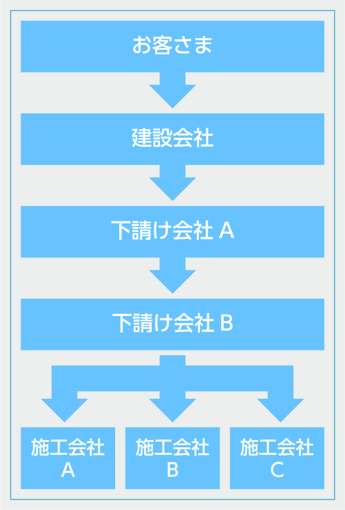 従来、内装工事はお客さまから地元の建設会社へ依頼を行い、その建設会社が下請け会社に依頼、さらにその会社が実際に施工を行う複数の会社に依頼を行う構造となっていました。そうなると当然、施工費用は高くつき、スピーディな対応は難しくなってしまいます。