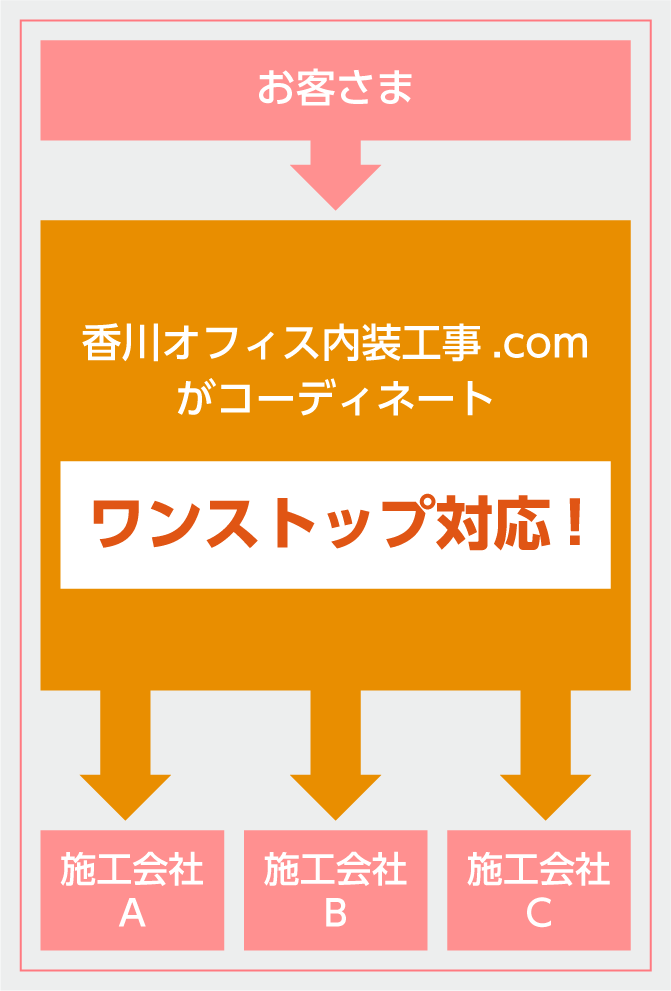 お客さまが安心してオフィス、事務所、店舗、施設をご利用できるように、香川オフィス内装工事.comではアフターフォロー体制も整えています。働きやすい空間、快適な仕事環境づくりのために、オフィス関連のことは当社までお気軽にご相談ください。